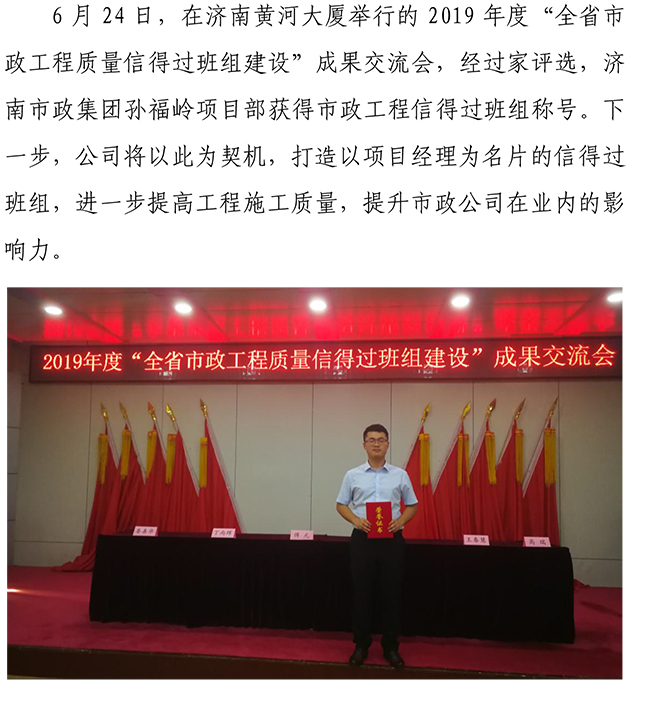 濟南市政集團項目部獲得山東省質(zhì)量信得過(guò)班組